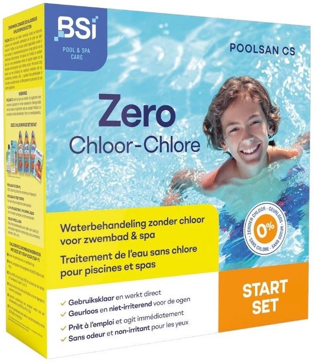 waardoor deze gemakkelijker uit het water verwijderd worden via filtersystemen en geen bron zijn voor andere bacteriën. Deze chloorvrije set bevat: PoolSan cs 250 ml: 100 % chloorvrij product ter voorkoming van algengroei , PoolSan 50 test strips: voor een veilig en doelgericht onderhoudsplan, 1 l pH up liquid+1 l pH down liquid: voor een ideale zuurtegraad van het zwembadwate en 1 kg Oxy-Pool & Spa: chloorvrije shockbehandeling voor helder water dankzij haar werking tegen organische verontreiniging zoals zonnecrèmes, huidvetten, oliën en urine.