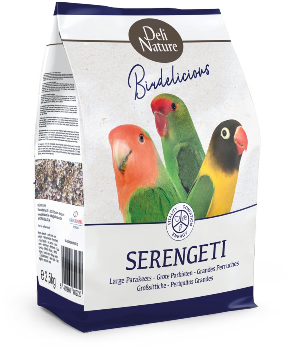 Deli Nature Grote Parkieten Serengeti BirdeliciousDeli Nature Grote Parkieten Serengeti Birdelicious is een complete mengeling voor Afrikaanse Parkieten, verrijkt met geextrudeerde pellets voor extra vitaminen en mineralen. Grit voor een optimale werking van het verteringssysteem. Bevat stukjes fruit en wilde zaden. Verkrijgbaar in 800 gr en 2,5 kg. * Geextrudeerde pellets voor extra vitaminen en mineralen * Grit voor een optimale werking van het verteringssysteem * Stukjes fruit en wilde zaden * Verkrijgbaar in 800 gr en 2,5 kg