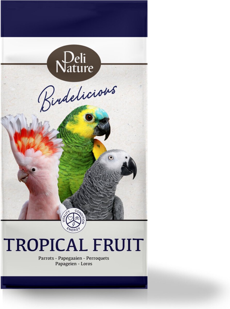 Deli Nature Birdelicious Tropical FruitJe wilt jouw vogel het allerbeste geven zodat hij niets tekort komt en in goede conditie verkeert. Met Deli Nature Birdelicious geef je jouw vogel alles wat hij verdient. Een uiterst gevarieerde mengeling op basis van hoogwaardig geselecteerde zaden en granen. Deli Nature Birdelicious Tropical Fruit is een ideale afwisseling en voeding voor jouw papegaai met een grote variatie noten en extra verrijkt met fruit! Deli Nature Birdelicious garandeert extra energie en vitaliteit. * Ideale afwisseling en versnapering * Grote variatie vruchten * Extra verrijkt met noten * Super premium kwaliteitGebruiksadviesGeef dagelijks een verse portie Deli Nature Birdelicious en drinkwater.Geef 2 à 3 maal per week Deli Nature eivoer of Deli Nature snacks als versnapering.