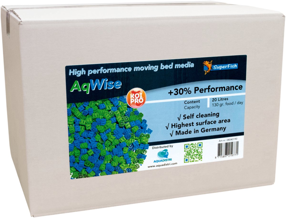 Hoeveel Aqwise Floating Bed Media heb ik nodig voor mijn vijver?100 liter Aqwise filtermedia kan gemiddeld 650 gram voer per dag afbreken, wat voldoende is voor 32,5 kilo aan Koi. Houd bij aanschaf van het floating bed filter en filtermedia alvast rekening met de groei van de vissen, die in de toekomst meer voer zullen gaan eten.
