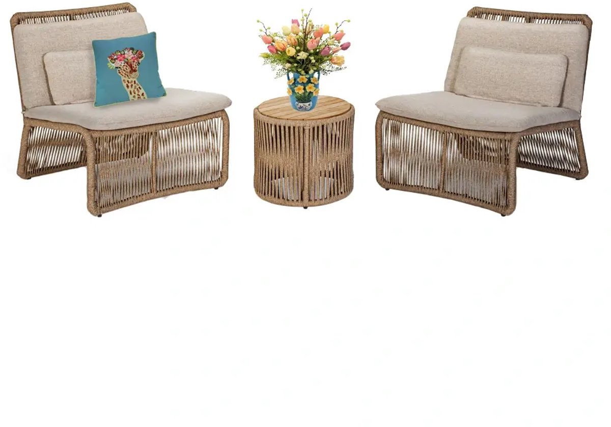 De Your Own Living Maxwell Relax Set bestaat uit twee stoelen en een ronde bijzettafel. De set is gemaakt van rope en heeft een aluminium frame. De tafel heeft een blad van teakhout. De relax set wordt geleverd inclusief stevige kussens.ProductvoordelenInclusief kussensWeerbestendigAfmetingen (cm)Stoel: L76 x B84 x H81Zitting: H43Bijzettafel: ø46 cm x H41 lees meer over dit product