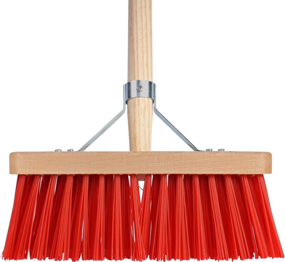 Deze bezem met kunststof haren, is geschikt voor buiten. De bezem is ook ideaal voor vochtige ondergronden, het nylon zorgt ervoor dat bij vocht de haren niet aan elkaar gaan klitten. Hij heeft een breedte van 28cm. De bezem is voorzien van een steel van 140cm. Ter ondersteuning is de steel met een verstevigingsbeugel aan de bezem gemonteerd. Zet na gebruik de bezem niet met de haren op de grond. U kunt hem beter ophangen of m... lees meer over dit product
