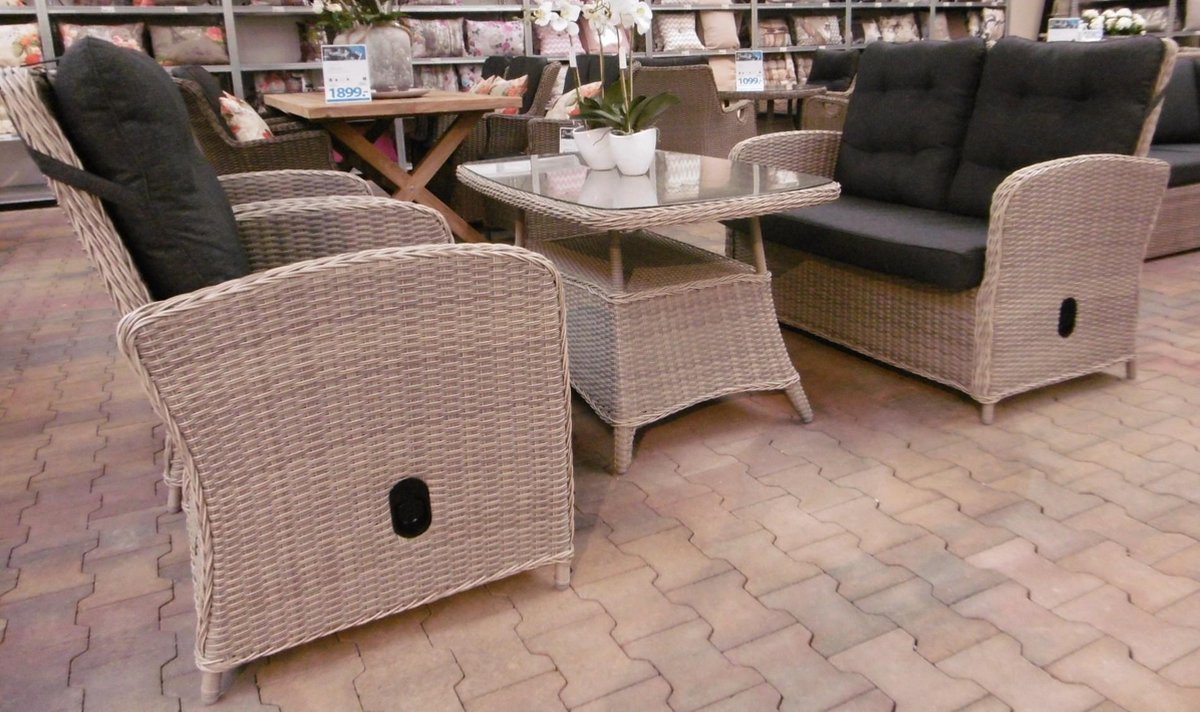 Ontspannen en genieten in deze luxe loungeset Prachtige loungeset van Your Own Living, bestaande uit een 2-zits bank, 2 royale fauteuils en een grote dining tuintafel met glasplaat. De fauteuils van de Moldes loungeset hebben een verstelbare rugleuning waardoor je er extra lekker in kan relaxen. De bank en fauteuils worden standaard geleverd met een stevig rug- en zitkussen voor optimaal comfort. De Moldes set is gemaakt van een mooie mix van off white en grijs materiaal, de gecapitonneerde rugkussens geven de set een klassieke uitstraling. Met deze gezellige, luxe loungeset zit je deze zomer zeker goed!Alle tuinmeubelen van Your Own Living bestaan uit solide aluminium frames en kunststof wicker vlechtwerk. Your Own Living tuinmeubelen zijn onderhoudsvriendelijk, weersbestendig en roesten niet. Samenwerking met Stichting Live-GreenYour Own Living tuinmeubelen zijn zorgvuldig getest op uitstraling, zitcomfort en duurzaamheid. Tuincentrum De Boet werkt als Your Own Living dealer samen met de stichting Live-Green. Live-Green draagt op maatschappelijk verantwoorde wijze bij aan het leefbaarder maken van de wereld. Met jouw aankoop van een Your Own Living tuinmeubel help je ook mee een leefbaardere wereld te creëren voor mens, dier en natuur.Bij gebruik van een hoes over de tafel (niet inbegrepen): Zorg ervoor dat er geen plasvorming kan ontstaan op de hoes. Plaats een vorstbestendige bloempot omgekeerd in het middel van het tafelblad, onder de hoes, zodat regenwater van de hoes af glijdt en er altijd ventilatie is onder de hoes. Anders kan het overmatige vocht de tafel beschadigen.Product voordelen100% weersbestendigOnderhoudsvriendelijkAfmetingen (cm)Tafel: L120 x B75 x H67Onderkant tafelregel: 63Stoel: L65 x B68 x H100Bank L125 x B68 x H100Zitting: D46 x H46Armleuning: H69