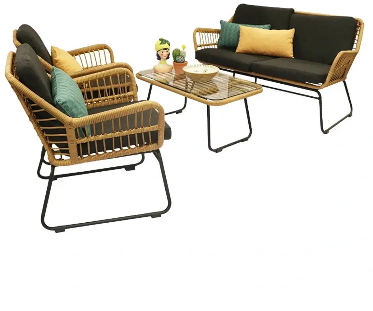 De Your Own Living Cooper Sofa Loungeset heeft een natuurlijke rotan look maar is gemaakt van onderhoudsvriendelijke materialen. De tuinmeubelen hebben een stevig aluminium frame en zijn omwikkeld met kunststof wicker. Het tafelblad is gemaakt van glas.De sofa loungeset bestaat uit een 2-zitsbank, 2 fauteuils en een salontafel. De tuinmeubelen worden geleverd inclusief comfortabele kussens.LET OP: de loungeset wordt geleverd e... lees meer over dit product