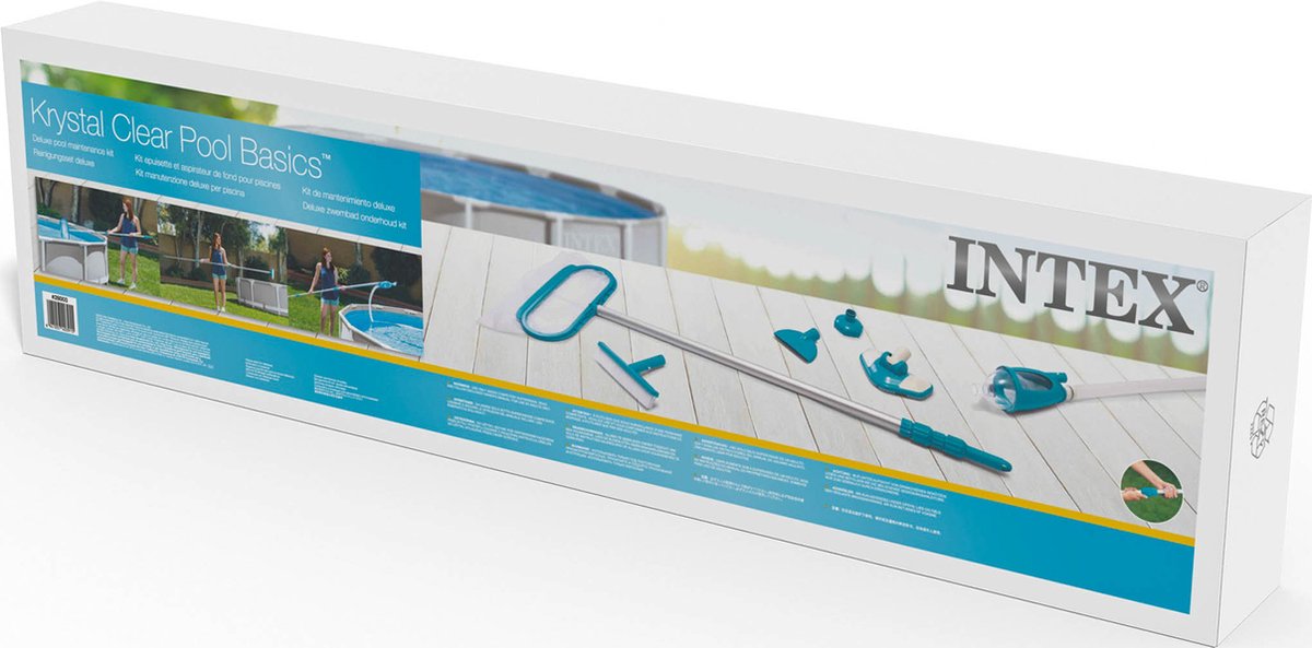 Intex Deluxe compleet onderhoudset die je helpt om jouw Intex zwembad netjes schoon te houden. De set bestaat uit een bodemzuiger met een slang van 7,5 meter lengte, een borstel, schepnet en een telescopische steel. De onderdelen zijn eenvoudig te gebruiken en van uitstekende kwaliteit.