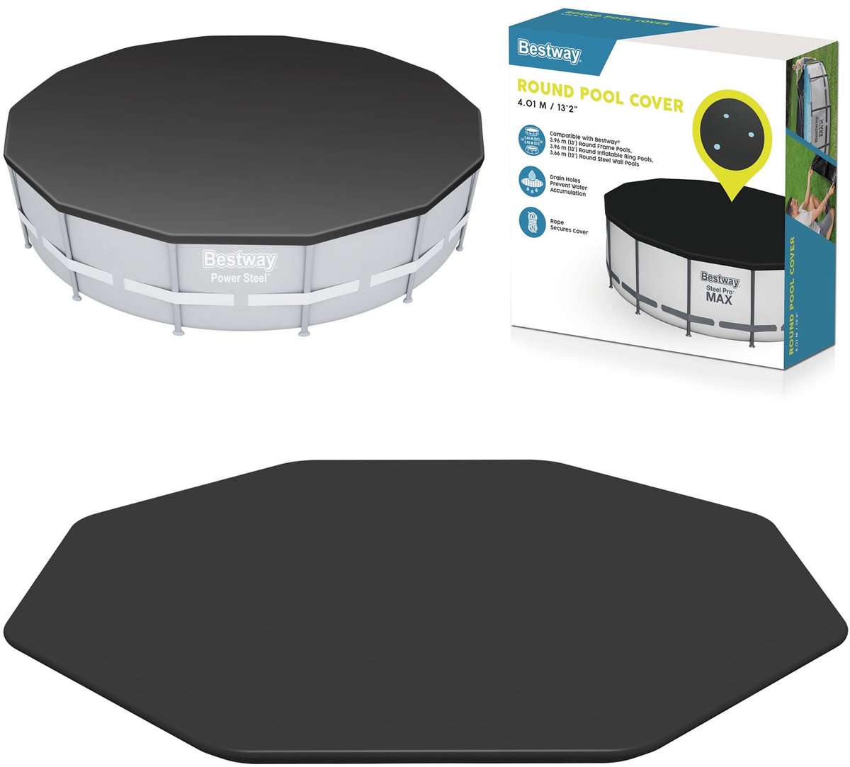 Deze ronde Bestway zwembad afdekhoes is geschikt voor zwembaden met een diameter van 396 cm en is gemaakt voor de Bestway Steel Pro en Power Steel zwembaden. De afdekhoes is voorzien van touwtjes zodat deze vast gezet kan worden. Kleine gaatjes in de Bestway afdekhoes voorkomen water ophoping. De zwembad afdekhoes gaat vervuiling van het zwemwater tegen.