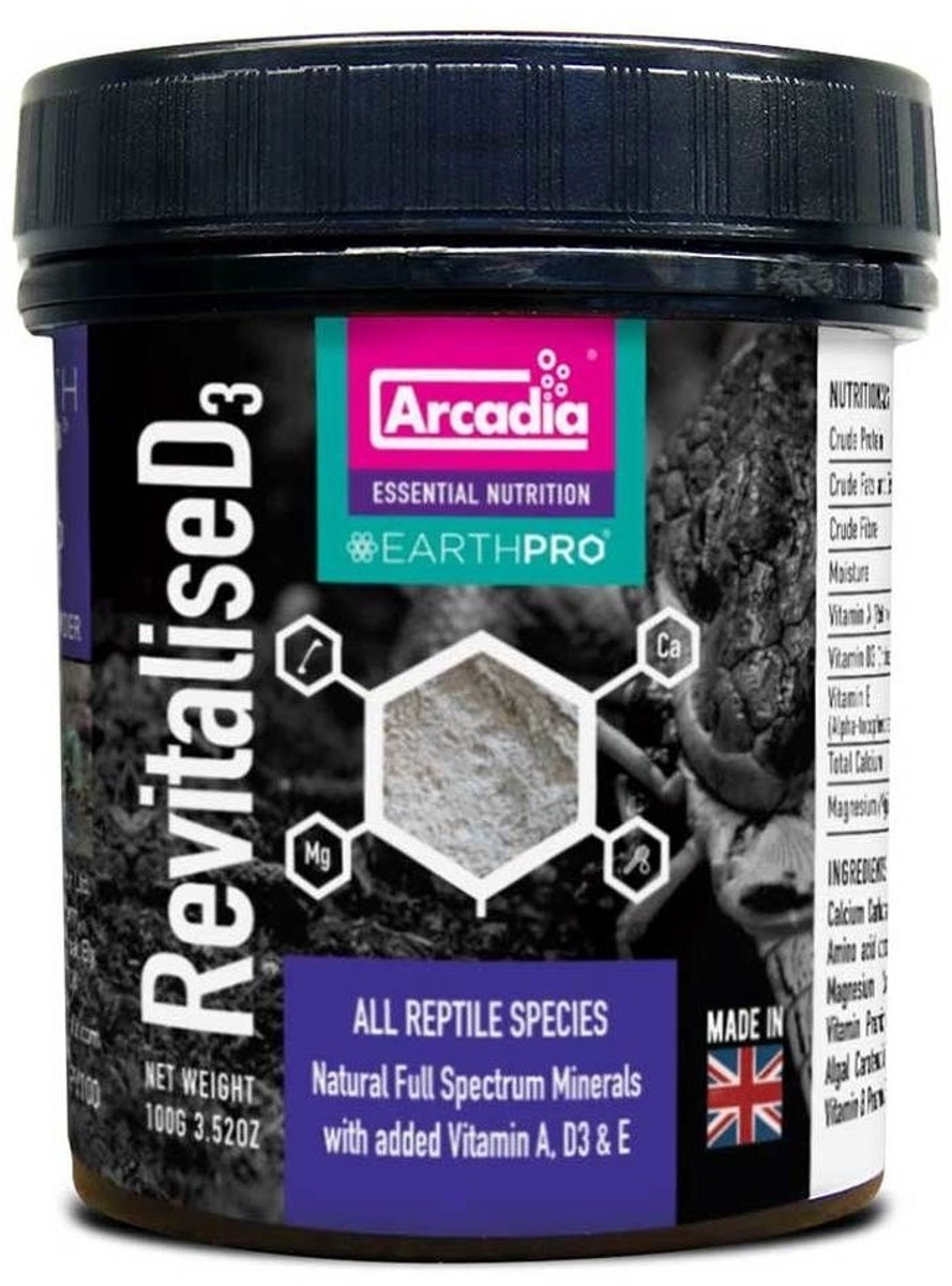 Arcadia EarthPro RevitaliseD3 is het resultaat van jarenlang rigoureus onderzoek en ontwikkeling en levert op een nieuwe en zeer effectieve manier essentiële mineralen en vitamines aan in gevangenschap gehouden dieren. Door samen te werken met gespecialiseerde dierenartsen, dierentuinen en reptielverzorgers over de hele wereld hebben we een gloednieuw ultrafijn poeder ontwikkeld. Dit kan worden gebruikt om de niveaus van voorgevormde vitamines A, D3 en E bij te vullen. Arcadia EarthPro RevitaliseD3 biedt de allerbeste balans van natuurlijke (aard)mineralen, aminozuren, full-spectrum carotenoïden, B-vitamines en bijenpollen, net zoals je zou verwachten van een Arcadia EarthPro product.