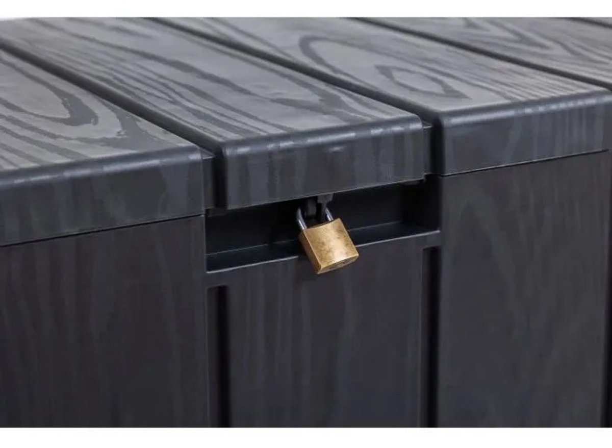 Kussenbox Bravo Antraciet Toomax, gemaakt van kunststof. Berg je tuinkussens of andere tuinspullen veilig op in deze stevige opbergbox voor buiten. De afmetingen van deze opbergbox zijn: l 117,5cm, b 45cm, h 56cm. Deze box is spatwaterdicht, dus niet volledig waterdicht. Bij extreme regen dient u de kussens binnen te leggen.