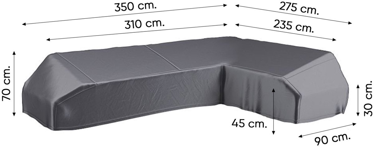 De Platinum AeroCover loungebankhoes L-vorm (350x275x90xH30/45/70cm) Rechts biedt betrouwbare bescherming voor L-vormige loungebanken met een platform rechts van 350x275x90xH30/45/70cm. Het ademende membraan helpt vocht naar buiten te transporteren en houdt tegelijkertijd vuil, stof en regen van buitenaf tegen. Dit is erg belangrijk om schimmelvorming op je loungebank tegen te gaan en de levensduur ervan te verlengen.