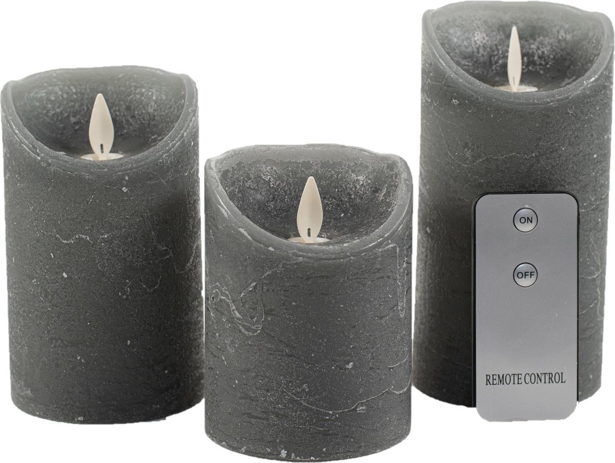 Kaarsen set van 3x stuks LED stompkaarsen in de kleur grijs. Deze set van rustieke LED stompkaarsen zijn gemaakt van echt wax en hebben een bewegende vlam, waardoor ze nauwelijks te onderscheiden zijn van echte kaarsen. Ideaal voor een veilige en sfeervolle verlichting in elke kamer.