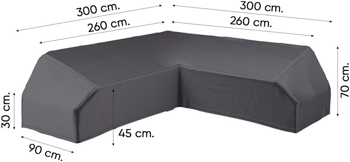 De Platinum AeroCover loungebankhoes L-vorm (300x300x90xH30/45/70cm) biedt betrouwbare bescherming voor L-vormige loungebanken met een platform van 300x300x90xH30/45/70cm. Het ademende membraan helpt vocht naar buiten te transporteren en houdt tegelijkertijd vuil, stof en regen van buitenaf tegen. Dit is erg belangrijk om schimmelvorming op je loungebank tegen te gaan en de levensduur ervan te verlengen.