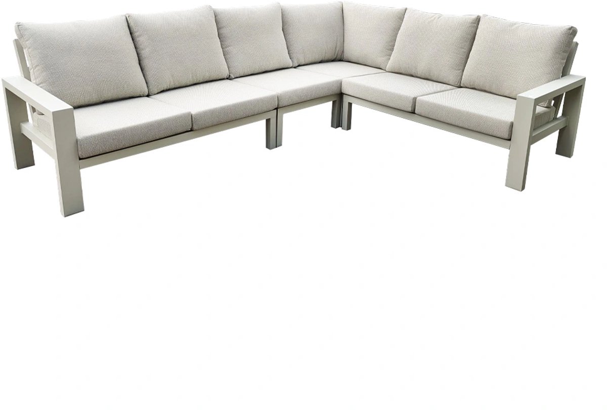 De Benton hoekloungebank van Trestino in latte biedt ruime zitplaatsen, zachte kussens en een uitnodigende uitstraling.