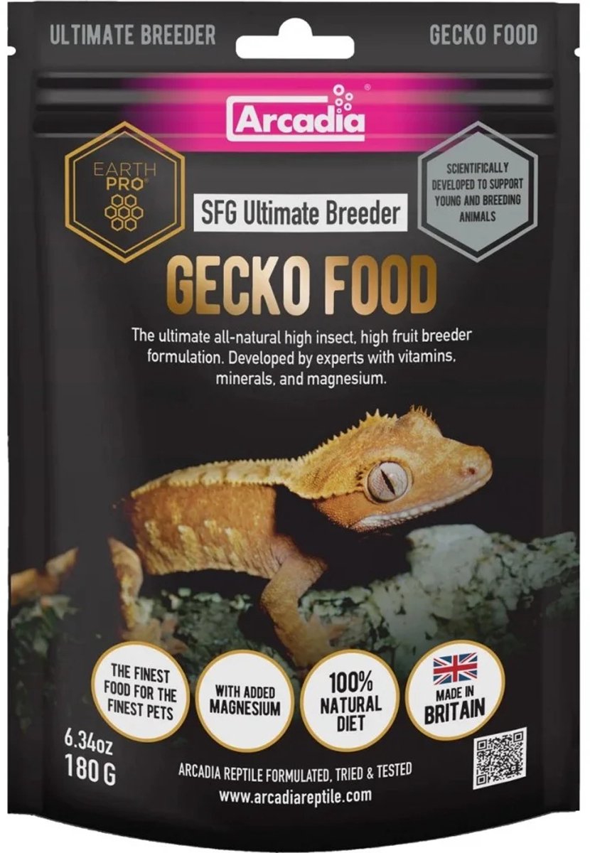 “SFG Breeder is een luxueus, volledig natuurlijk dieet met extra insecteneiwitten, echte vruchten, vitaminen en mineralen, speciaal voor kweek en groei.” - Arcadia Reptile