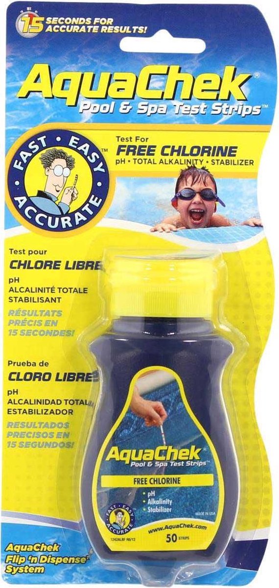 AquaChek Yellow 4-in-1 Teststrips voor Zwembad- en Spa (50st.)Inhoud: 50 stuks. De AquaChek 4-in-1 teststrips meet de 4 belangrijkste waterwaardes in je water; Chloor (vrije chloorwaarde),pH, stabilisatie en alkaliteit. Het zorgt voor gezond water in je zwembad, spa of hottub. Na één dip van een paar seconde kun je de waarde direct aflezen. We adviseren om 2 keer in de week je bad te controleren op de verschillende waardes.... lees meer over dit product