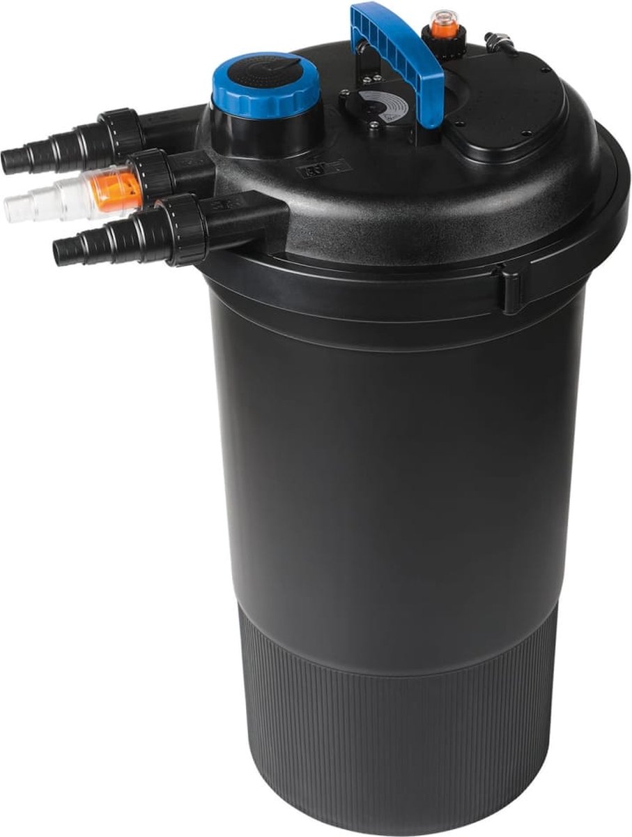 De Ubbink BioPressure II 36000 is een gebruiksvriendelijk en eenvoudig te plaatsen drukfilter (weerstand 0,49 bar) voor vijvers met een inhoud van 20000 tot 36000 liter. In tegenstelling tot zwaartekrachtfilters gebruikt het BioPressure II-drukfilter de volledige pompdruk om het water door het filter te persen. Het gezuiverde water kan vervolgens tot een hoogte van 1,50 meter worden opgevoerd, bijvoorbeeld naar het hoger gelegen begin van een beek. - BioPressure II is een compact en efficiënt drukfilter met "helderwatergarantie" van Ubbink. - BioPressure II is de ideale oplossing om water naar een hoger gelegen beekloop toe te voeren. - BioPressure II werkt ook onder het wateroppervlak en kan dus ingegraven worden voor een perfecte camouflage. - BioPressure II kan gereinigd worden zonder het deksel te openen. De klemsluiting garandeert een volledige waterdichtheid van het filter.