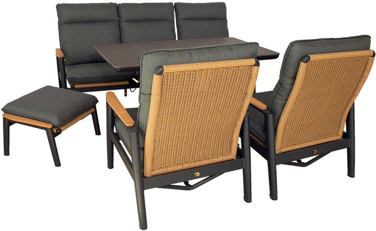 Louviers lounge set midnight grey. De Loungeset Louviers uit de eigen collectie is een mooie en sfeervolle loungeset. De set bestaat uit een 3 zitsbank, 2 loungestoelen en 2 praktische tafeltjes. De bank en stoelen zijn afgewerkt met een mooi teak houten armleuning. De lounge tafels zijn in 2 verschillende afmetingen en hoogtes om een speels effect te creëren. De loungeset wordt geleverd inclusief kussens. Dit komt uit het ass... lees meer over dit product