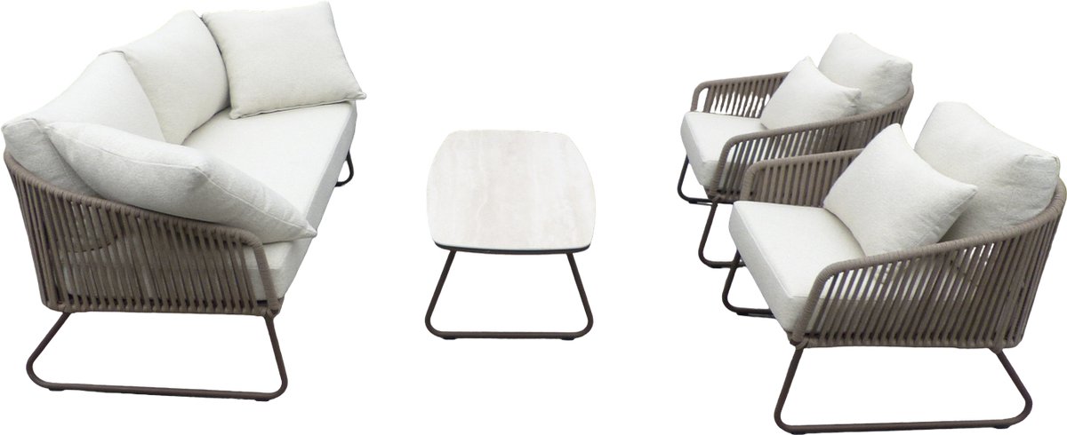 Calera 4 piece loungeset aluminium bronze/belt toffee/wool white AW. 4-delige Calera loungeset in aluminium bronze met belt toffee en wool white kussens.