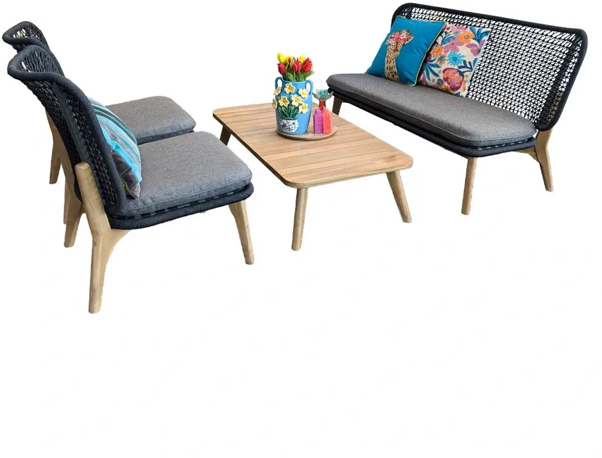 In de Vergalda Sofa Loungeset - Antraciet zit je deze zomer goed! Deze complete loungeset bestaat uit een 2-zits bank, 2 stoelen en een salontafel. De set wordt geleverd inclusief stevige kussens. De tuinmeubelen hebben een stevig frame gemaakt van acaciahout en aluminium. De zitting en rugleuning is omwikkeld met rope. De salontafel is ook gemaakt van acaciahout.ProductvoordelenDuurzaamInclusief kussensOnderhoudsvriendelijkAf... lees meer over dit product