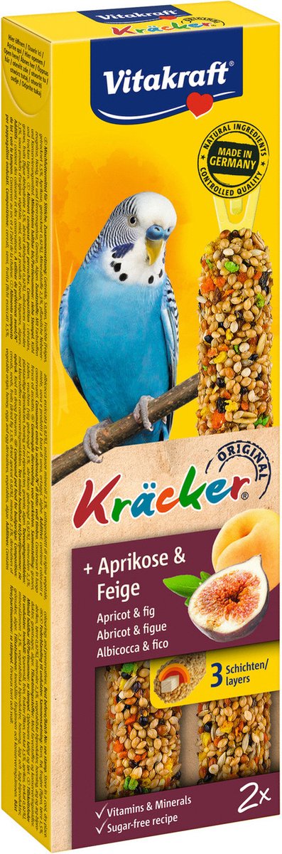 De originele Vitakraft Kräckers zijn een verantwoorde lekkernij en bevatten lekkere granen, abrikozen en vijgen op een natuurlijk knabbelhoutje. De Kräckers zijn lekker van smaak en 3-voudig gebakken waardoor de ingrediënten stevig vastzitten en de parkiet bezig wordt gehouden zoals dit in de vrije natuur ook gebeurt. Dit zorgt ervoor dat de snavel van de Parkiet op natuurlijke wijze afslijt. De Kräckers zijn afgestemd op de voedingsbehoefte van de vogel. Het Vital-Complex voorkomt gebreksverschijnselen en zorgt voor extra vitaliteit van het dier. De Kräckers bevatten waardevolle vitamines, zijn bereid volgens een suikervrije receptuur en zijn gemakkelijk in de kooi op te hangen door de cliphouder aan de Kräcker.