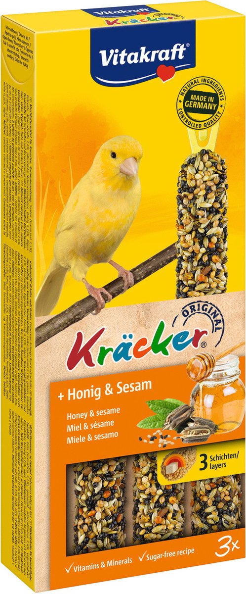 De originele Vitakraft Trio Kräckers zijn een heerlijke lekkernij en bevatten 3 heerlijke Kräckers met granen, zaden, sesam en honing op een natuurlijk knabbelhoutje. De Kräckers zijn lekker van smaak en 3-voudig gebakken waardoor de ingrediënten stevig vastzitten en de kanarie bezig wordt gehouden zoals dit in de vrije natuur ook gebeurt. Dit zorgt ervoor dat de snavel van de kanarie op natuurlijke wijze afslijt. De Kräckers zijn afgestemd op de voedingsbehoefte van de vogel. Het Vital-Complex voorkomt gebreksverschijnselen en zorgt voor extra vitaliteit van het dier. de Kräckers bevatten waardevolle vitamines, zijn bereid volgens een suikervrije receptuur en zijn gemakkelijk in de kooi op te hangen door de cliphouder aan de Kräcker.