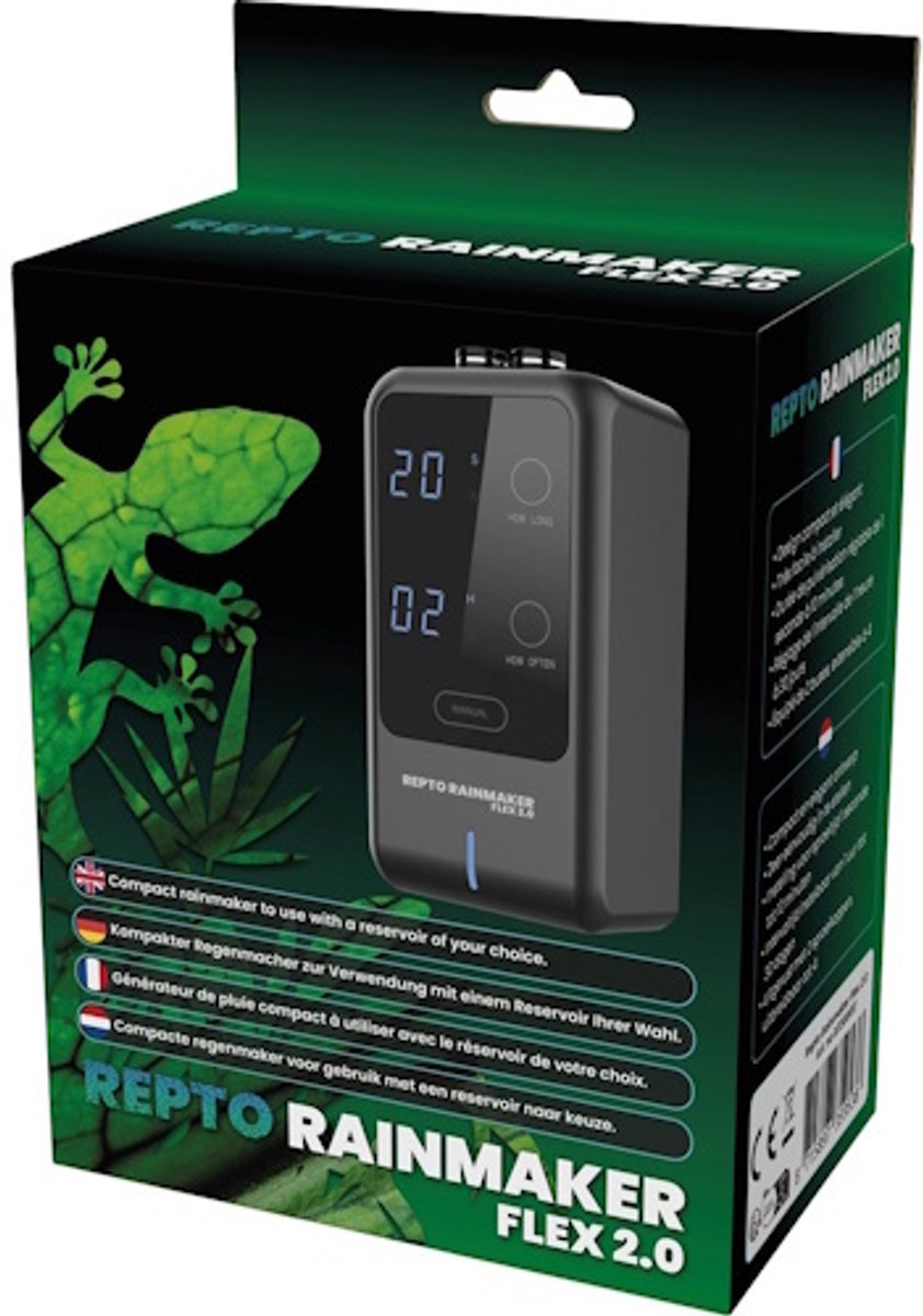 Onderhoud en duurzaamheidDe Repto Rainmaker Flex 2.0 is gebouwd voor langdurig gebruik en vraagt minimaal onderhoud. Het is aan te raden om het waterreservoir regelmatig te reinigen en gebruik te maken van schoon, bij voorkeur gefilterd of osmosewater, om kalkaanslag en verstopping van de sproeiers te voorkomen. De sproeikoppen en slangen kunnen eenvoudig losgemaakt en doorgespoeld worden, waardoor het systeem altijd optimaal blijft functioneren. De stevige behuizing beschermt de elektronica tegen vocht en stof, terwijl de degelijke materialen zorgen voor een lange levensduur. Dankzij de uitbreidbare mogelijkheden kun je het systeem aanpassen aan nieuwe behoeften zonder het volledig te vervangen. Ook de eenvoudige bediening zorgt ervoor dat je niet onnodig veel tijd kwijt bent aan instellingen of onderhoud. Dit maakt de Repto Rainmaker Flex 2.0 een betrouwbare keuze voor zowel beginnende als gevorderde terrariumliefhebbers die op zoek zijn naar een duurzame, efficiënte en gebruiksvriendelijke beregeningsoplossing.