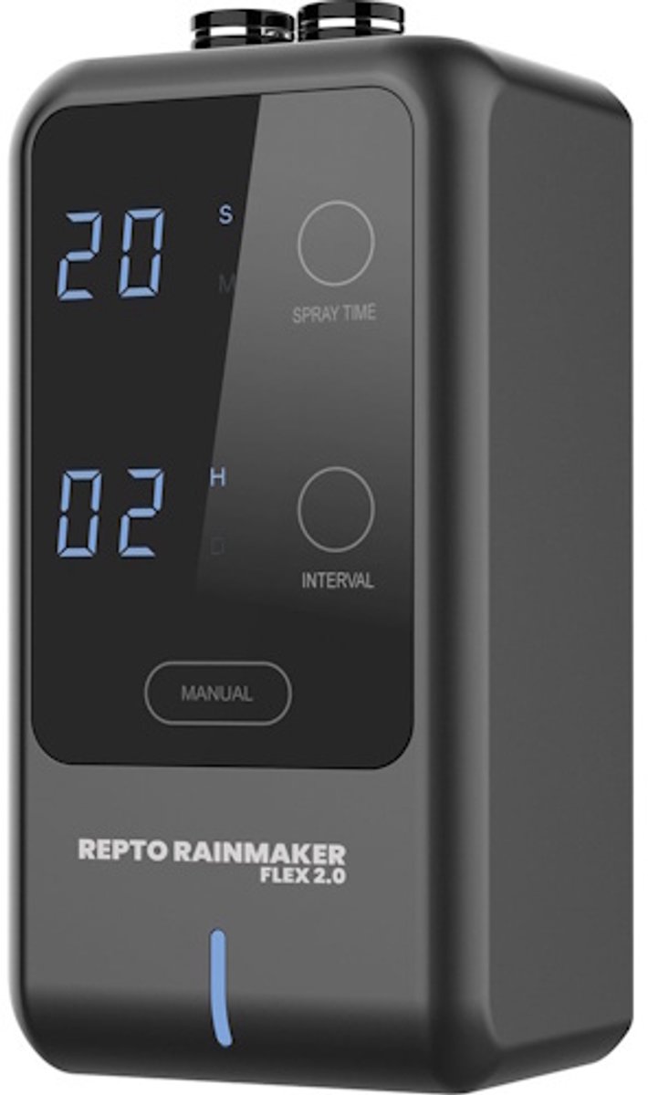 Instelbare sproeitijd en intervallenMet de Repto Rainmaker Flex 2.0 heb je volledige controle over de sproeicyclus in je terrarium. De sproeitijd is instelbaar van slechts 1 seconde tot maar liefst 2 minuten, waardoor je zowel korte verfrissingsmomenten als langere regenbuien kunt simuleren. De intervaltijd kan worden ingesteld van 1 uur tot 30 dagen, zodat je het sproeipatroon volledig kunt afstemmen op de behoeften van je dieren en planten. Dit is ideaal voor soorten die een constant vochtige omgeving nodig hebben, maar ook voor terraria die slechts af en toe verneveld hoeven te worden. Dankzij deze flexibiliteit kun je natuurlijke seizoenscycli nabootsen, bijvoorbeeld door in de ‘regentijd’ vaker en langer te sproeien en in de ‘droge tijd’ minder vaak. Zo ondersteun je het natuurlijke gedrag van je dieren en stimuleer je bijvoorbeeld voortplanting bij soorten die afhankelijk zijn van regenperiodes. Met deze instelopties is de Repto Rainmaker Flex 2.0 geschikt voor zowel beginners als ervaren terrariumhouders.