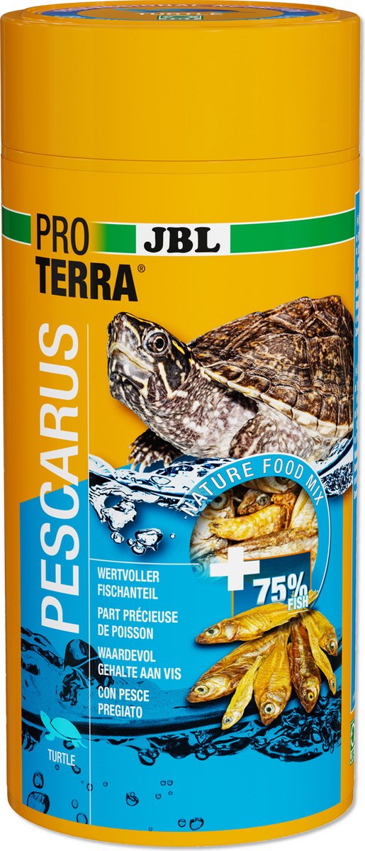 De Proterra Pescarus bevat hele vissen en garnalen als lekkernij voor alle water- en moerasschildpadden. Zacht gedroogde, hele vissen en garnalen leveren waardevolle voedingsstoffen, net als in de natuur. Formaat: garnalen ca. 3 cm, vissen tot ca. 9 cm. De ideale, soortspecifieke en energierijke aanvulling op andere soorten voer, bijv. JBL PROTERRA CRUSTARUS. De gedroogde vissen & garnalen drijven op het wateroppervlak. JBL expedities tonen aan: vissen vormen voor de meeste waterschildpadden de primaire voeding en leveren naast eiwit ook een groot en belangrijk aandeel fosfor en calcium. Zonder toevoeging van kunstmatige kleurstoffen en conserveringsmiddelen. Potje, deksel, folie en etiket 100% recyclebaar. Deze verpakking bevat 1000ml.