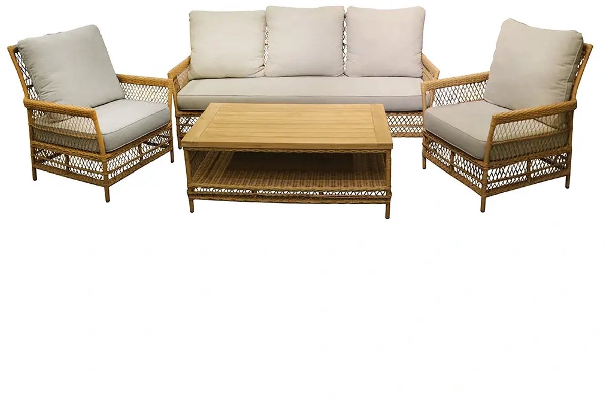 In de Your Own Living Eastfield Sofa Loungeset zit je deze zomer goed! Deze zeer complete loungeset bestaat uit een 3-zits bank, 2 fauteuils en een koffietafel. De set wordt geleverd inclusief stevige & comfortabele kussens. De tuinmeubelen hebben een stevig aluminium frame en zijn omwikkeld met kunststof wicker vlechtwerk. De tafel is voorzien van een tafelblad van teak.ProductvoordelenDuurzaamWeerbestendigInclusief kussensOn... lees meer over dit product