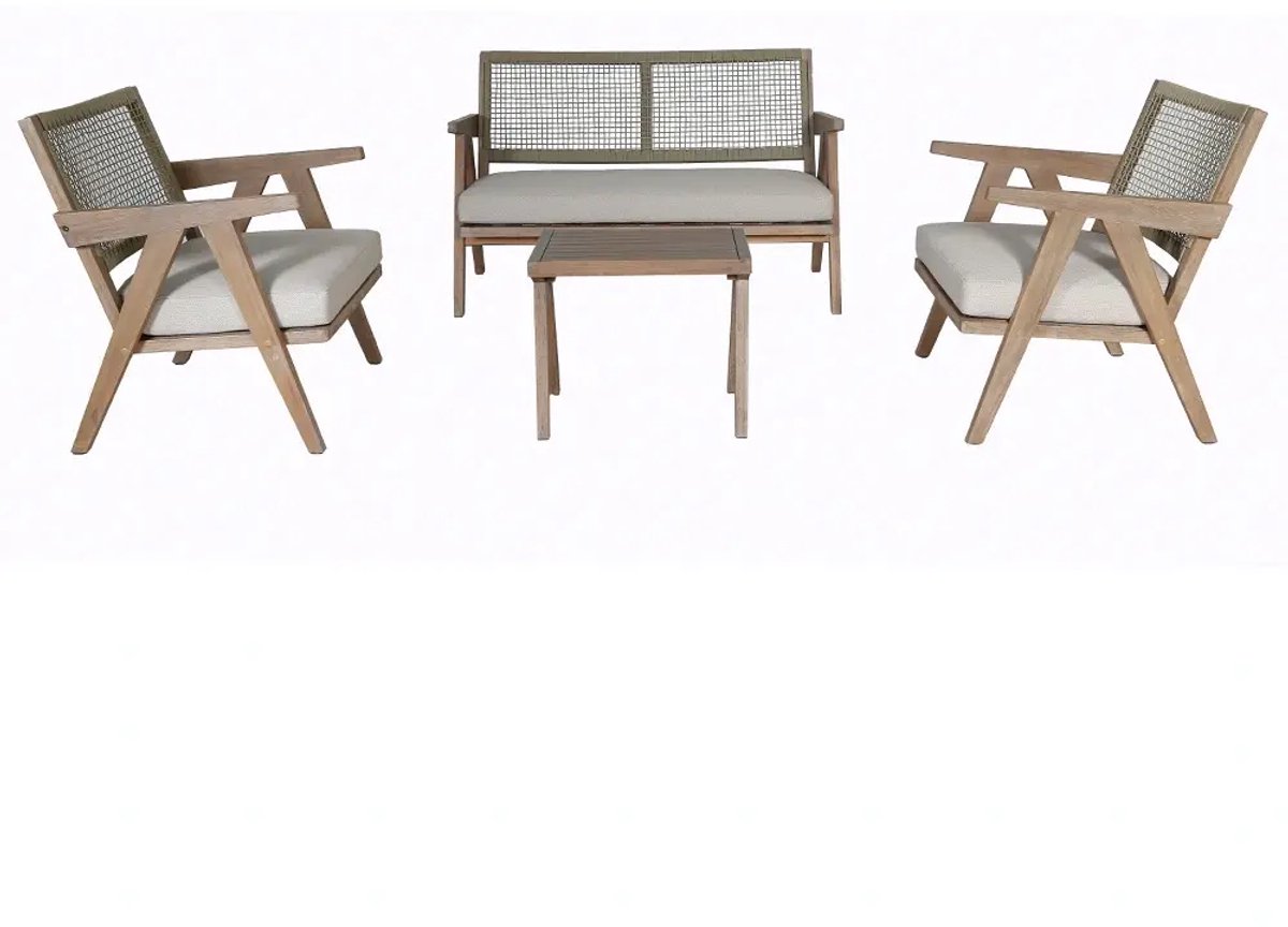 In de Buitengewoon Boet Piet Sofa Loungeset 4-dlg zit je deze zomer heerlijk! De set bestaat uit een tweezitsbank, 2 lounge fauteuils en 1 bijzettafel.De set wordt geleverd met stevige kussens. De tafels zijn gemaakt van acaciahout en de zitmeubelen van acaciahout en rope.Product voordelen:Inclusief comfortabele kussensAfmetingen (cm)Bank: L119 x B66 x H77 cmStoel: L66 x B68,5 x H77 cmZitting: D52 x H39 cmArmleuning: H56/61 cmTafel: L45 x B45 x H47 cm