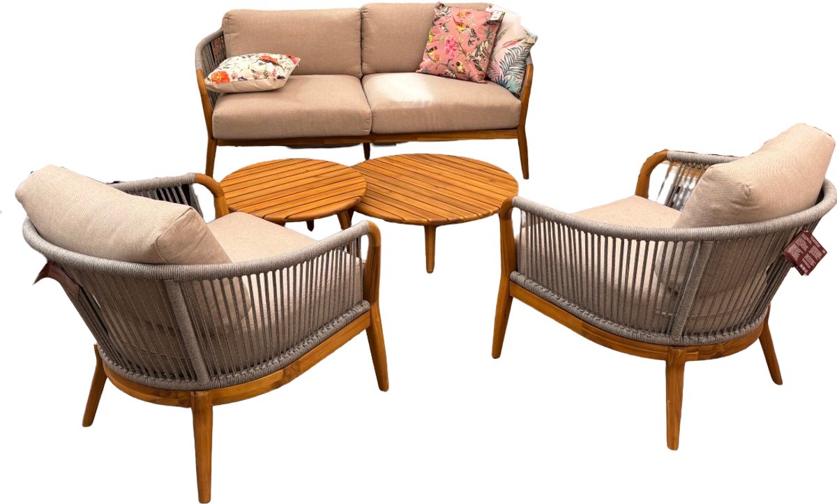 Kosana loungeset 5-delig. De Kosana set bestaat uit een bank (L 178 x D 83 x H 71 cm),twee fauteuils (L 82 x D 83 x H 71 cm) en twee tafels (Ø80 x H 25 cm en Ø60 x H 34 cm). Dit komt uit het assortiment Tuinsets, koop hem gemakkelijk en goedkoop online! Dit product verkopen wij per stuk tenzij anders aangegeven. lees meer over dit product