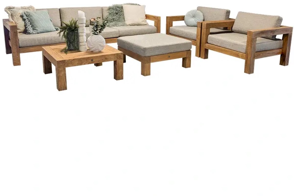 Creëer een warme sfeer in de tuin met de Springdale Sofa Loungeset. De robuuste loungeset is gemaakt van teakhout en wordt geleverd inclusief stevige kussens.Deze sofa loungeset bestaat uit een 3-zits loungebank, 2 lounge tuinstoelen, 1 salontafel en een hocker.LET OP: deze set wordt geleverd exclusief accessoires.Product voordelen:Inclusief stevige kussensAfmetingen (cm)Bank: B255 x D89 x H59Stoel: B97 x D98 x H59Hocker: L79 ... lees meer over dit product