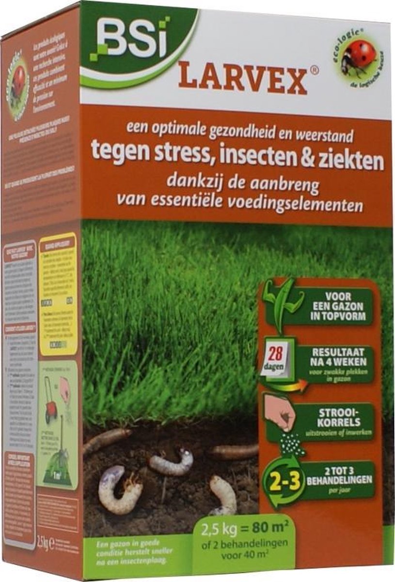 Productbeschrijving Larvex: voor een optimale gezondheid van uw gazon en een grote weerstand tegen stress, insecten en ziekten. BSI Larvex geeft een optimale gezondheid aan het gazon dankzij de aanbreng van onmisbare voedingselementen, zodat de plant-eigen weerstand van het gazon de aanval van insecten of hun larven overleeft, veel beter de nadelige invloed van deze insecten verdraagt en snel herstelt. Bovendien gaat het worte... lees meer over dit product