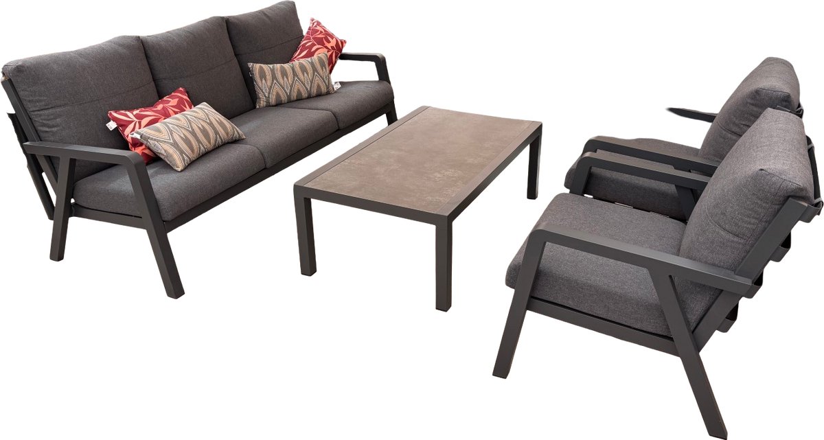 Domenico loungeset met tafel antraciet 4-delig. De Domenico loungeset bestaat uit een loungebank (L 190 x B 77 x H 78 cm),twee fauteuils (L 70 x B 77 x H 78 cm) en een tafel (L 120 x D 70 x H 44 cm),allemaal uitgevoerd in stevig aluminium.