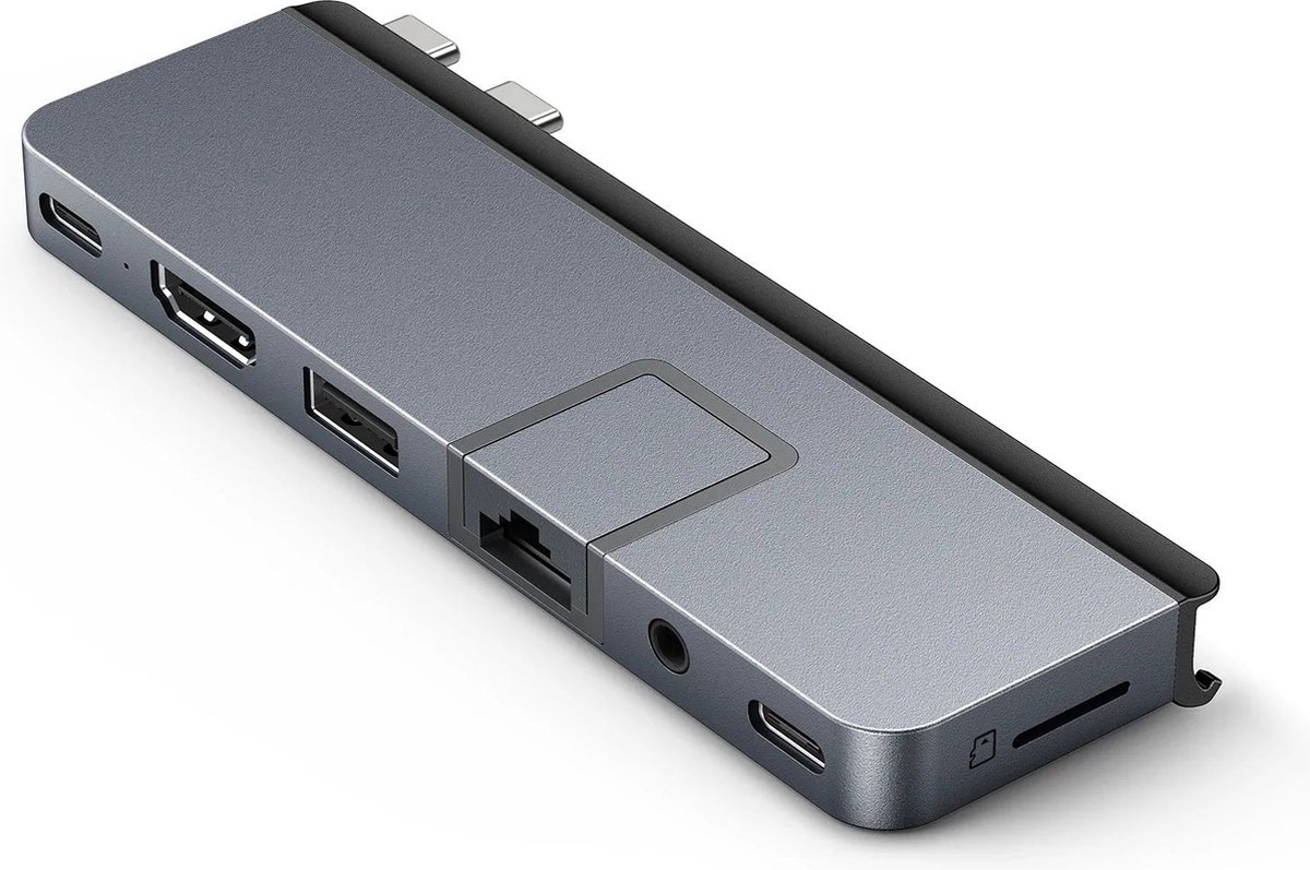 De HyperDrive DUO PRO 7-in-2 USB-C Hub is een USB-C dockingstation met 7 poorten, ontworpen voor de nieuwe 14" & 16" MacBook Pro die ook werkt met elke 2016-2021 en latere MacBook. Deze form-fit hub biedt direct Gigabit Ethernet, USB-A 5Gbps, USB-C 5Gbps, MicroSD 104 MB/s en een 3,5mm Audio Combo Jack. Het beschikt ook over HDMI 4K 60Hz display ondersteuning en een Thunderbolt 4 / USB4 compatibele poort (40Gbps, 100W PD, 6K 60Hz video). Daarnaast biedt de universele USB-C adapter compatibiliteit met Chromebook, PC of USB-C iPad, en de verlengde USB-C aansluiting zorgt voor compatibiliteit met of zonder beschermhoes.