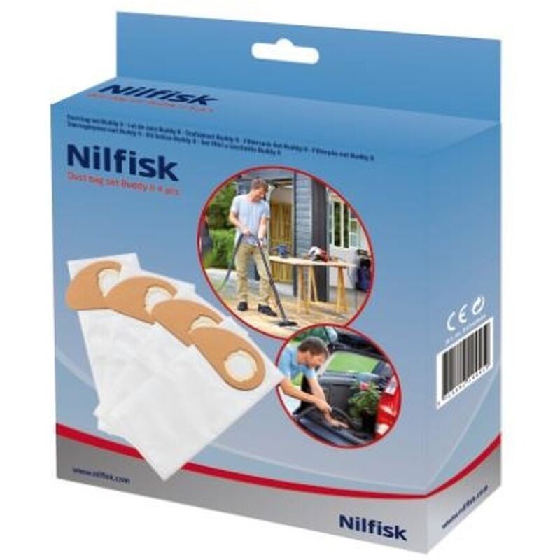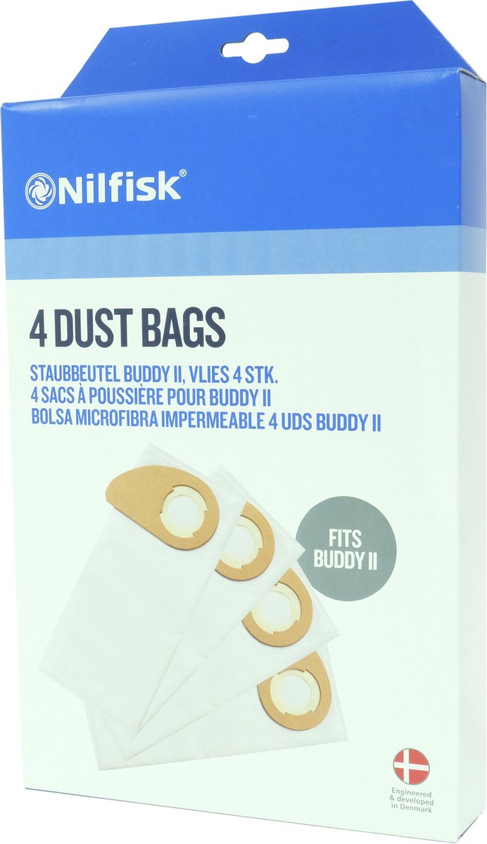 De Nilfisk set van 4 stofzakken past op de natte/droge stofzuigers van de Buddy II serie.
