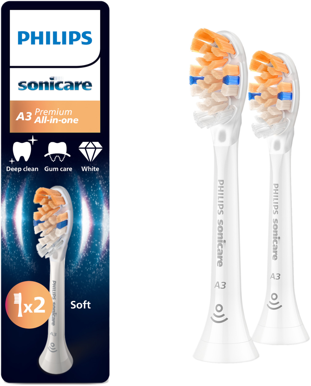 Philips Sonicare Premium All-in-One A3 – Opzetborstels voor Elektrische Tandenborstel – Wit – Verpakking van 2 - HX9092/87 De A3 Premium All-in-One opzetborstel is de opzetborstel die je nodig hebt voor schonere en wittere tanden en gezonder tandvlees. Deze opzetborstel verwijdert 20x zoveel tandplak, vermindert vlekken met tot wel 100% en maakt tandvlees tot wel 15x gezonder in slechts 2 weken. Ook zorgt de vervangingsherinn... lees meer over dit product