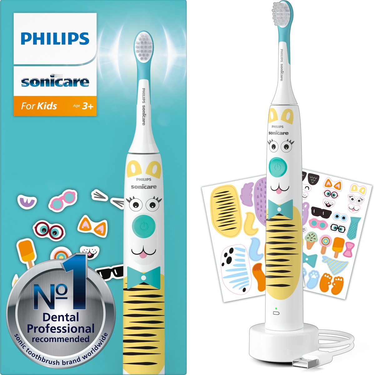 - 1x 1 Sonicare for Kids PET-handvat, 1x Sonicare Kidscompact Opzetborstel, 1x Oplaadstation met USB-oplader, 2x Stickervellen met Huisdierthema