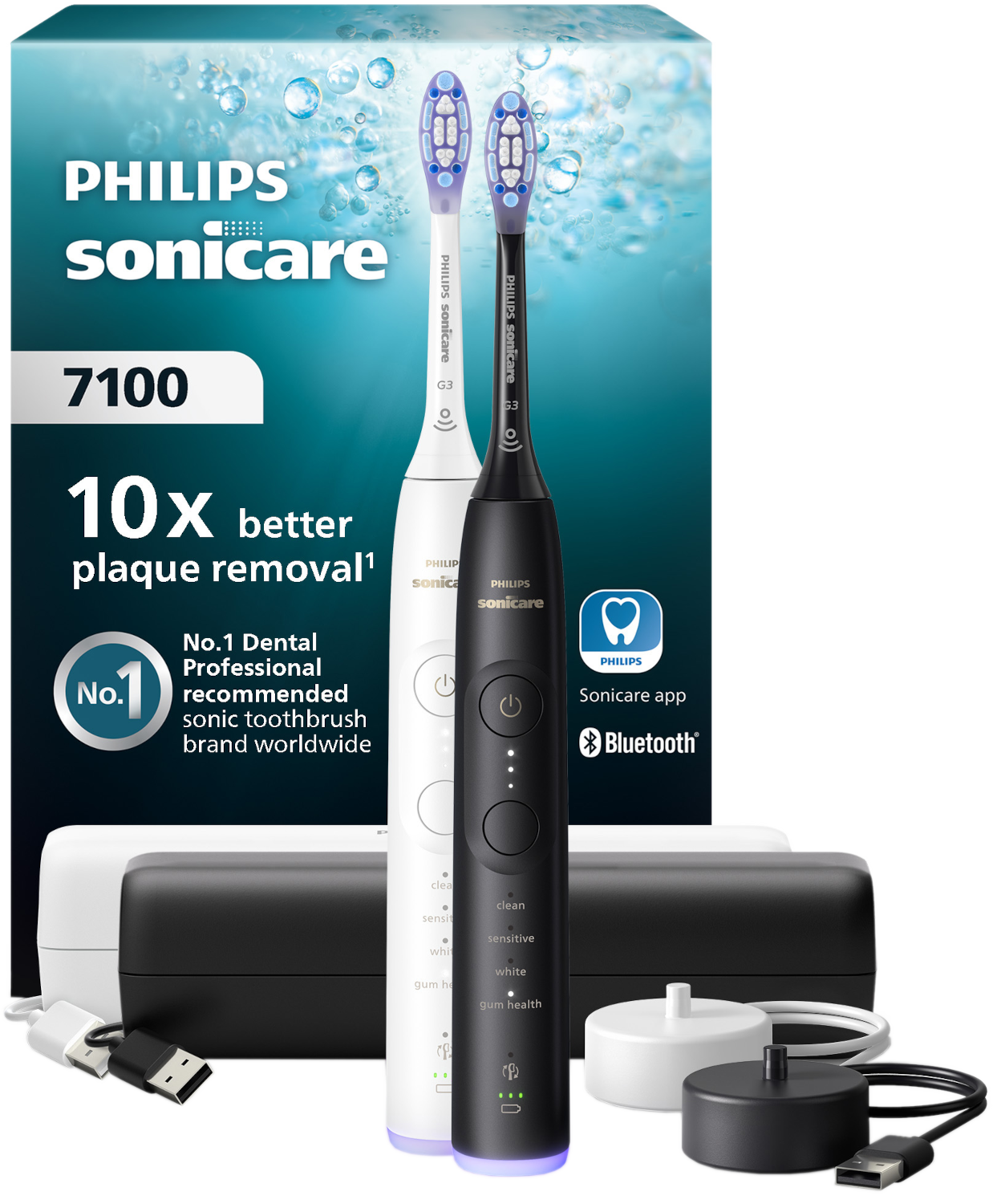 De Philips Sonicare 7100 Series - Elektrische Tandenborstels - Duopack – Reisetui - Wit&Zwart worden geleverd met de Premium Gum Care-opzetborstel die de gezondheid van het tandvlees verbetert. Daarnaast laat de tandenborstel weten wanneer je te hard poetst en wanneer je de opzetborstel moet vervangen. De tandenborstel kan verbonden worden met de Sonicare-app die je helpt beter en aandachtiger te poetsen voor een complete mondverzorging.