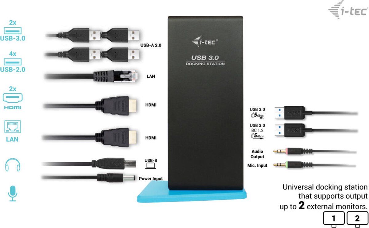 De i-tec USB 3.0/USB-C Dual HDMI is een universeel dockingstation compatibel met alle laptop merken en modellen, geleverd met een 100 cm USB 3.0 kabel met geïntegreerde adapter voor zowel USB-C als Thunderbolt 3. Het dockingstation ondersteunt maximaal twee externe monitoren, die je aansluit dankzij HDMI-poorten. Geniet van zes USB-poorten, betrouwbare en snelle aansluiting op het internet dankzij een geïntegreerde LAN-poort. ... lees meer over dit product