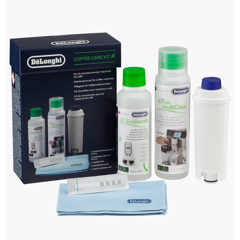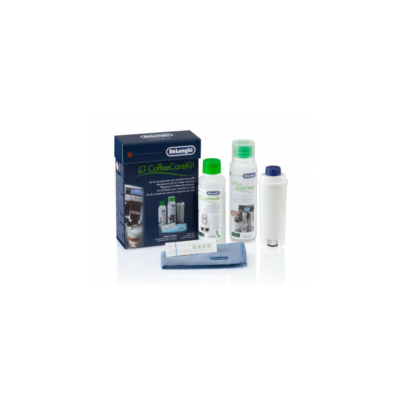 De De'Longhi Coffee Care Kit DLSC306 bevat een fles EcoDecalk van 200ml, een fles Eco MultiClean van 250ml, een waterfilter, een waterhardheidsstripje en een microvezeldoek. Met andere woorden: alle benodigdheden om nog langer van jouw machine te genieten.