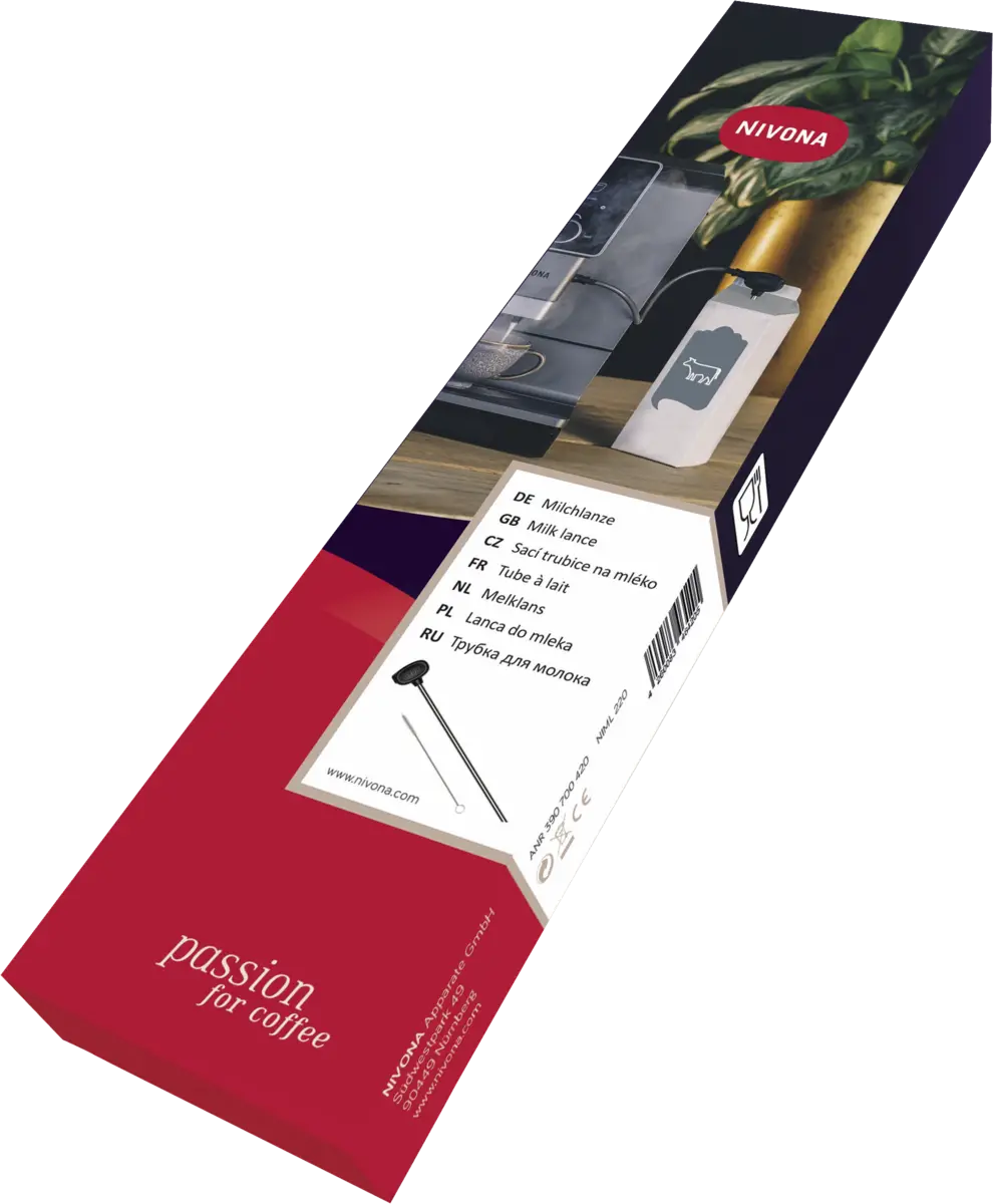 Opmerkelijk eenvoudig: De NIVONA-melklans is de praktische methode om de melk direct bij de NIVONA te krijgen. Hoe? Heel eenvoudig. Zonder aanvullende slang of adapter. Simpelweg de melklans in het melkpak steken en klaar. Het melkpak kan daarna ook zonder problemen direct in de koelkast worden geplaatst. Daarnaast kan de melklans eenvoudig met het meegeleverde borsteltje en zeepwater worden gereinigd.