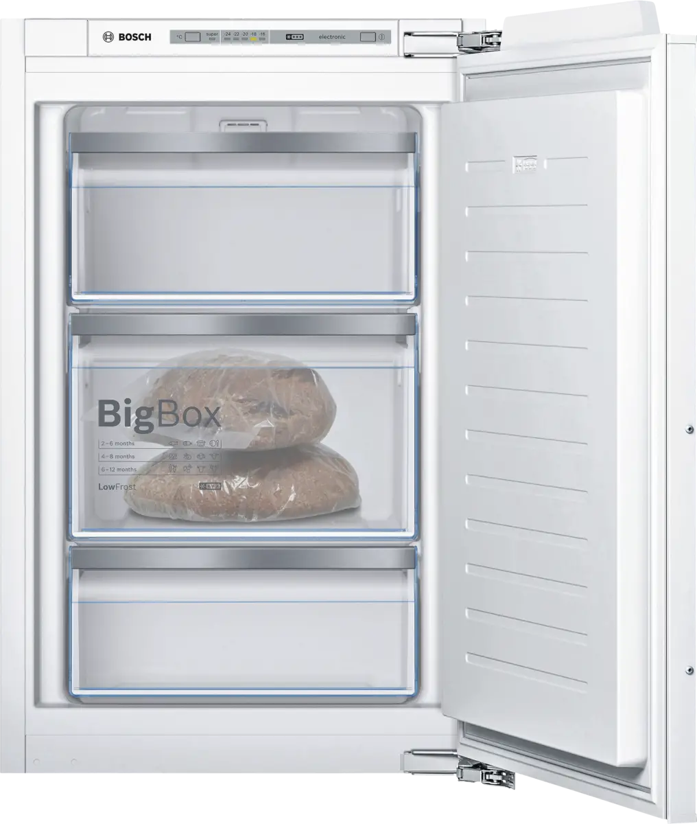 De Bosch GIV21AFE0 Serie 6 inbouw vriezer is een compacte en efficiënte vriesoplossing met drie transparante vrieslades en een Super Vriezen functie om nieuwe etenswaren snel in te vriezen. De Low Frost technologie vermindert ijsvorming, wat tijd, moeite en energie bespaart door minder vaak te hoeven ontdooien. Met de ruime Big Box-lade kun je eenvoudig grote diepvriesproducten of vershouddozen opbergen, en een alarm waarschuw... lees meer over dit product