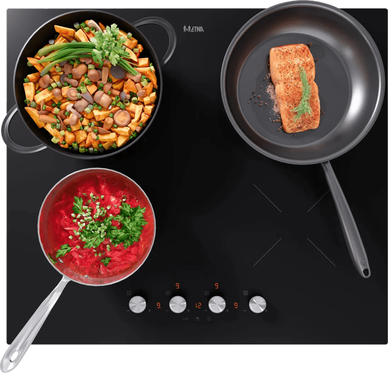 De ETNA KI560KZT inductiekookplaat bedien je gemakkelijk met de handige draaiknoppen. Maak je favoriete gerechten klaar op de 4 kookzones. Wil je snel een pan macaroni op tafel zetten? Kies dan voor de boostfunctie. Iedere kookzone beschikt over deze functie en warmt daardoor tijdelijk extra snel op. Dankzij de 10 kookstanden kies je makkelijk de juiste temperatuur voor jouw wokschotel. De kinderbeveiliging voorkomt dat nieuwsgierige kinderhandjes gevaar lopen en de timers geven een seintje wanneer jouw gerecht klaar is om te serveren. Oeps, vergeten de kookwekker te zetten en nu kookt je pan over? Geen paniek, de kookplaat schakelt automatisch uit bij overkoken. Na het koken geeft de kookplaat met restwarmte indicatie aan welke kookzone volledig is afgekoeld en welke nog niet.