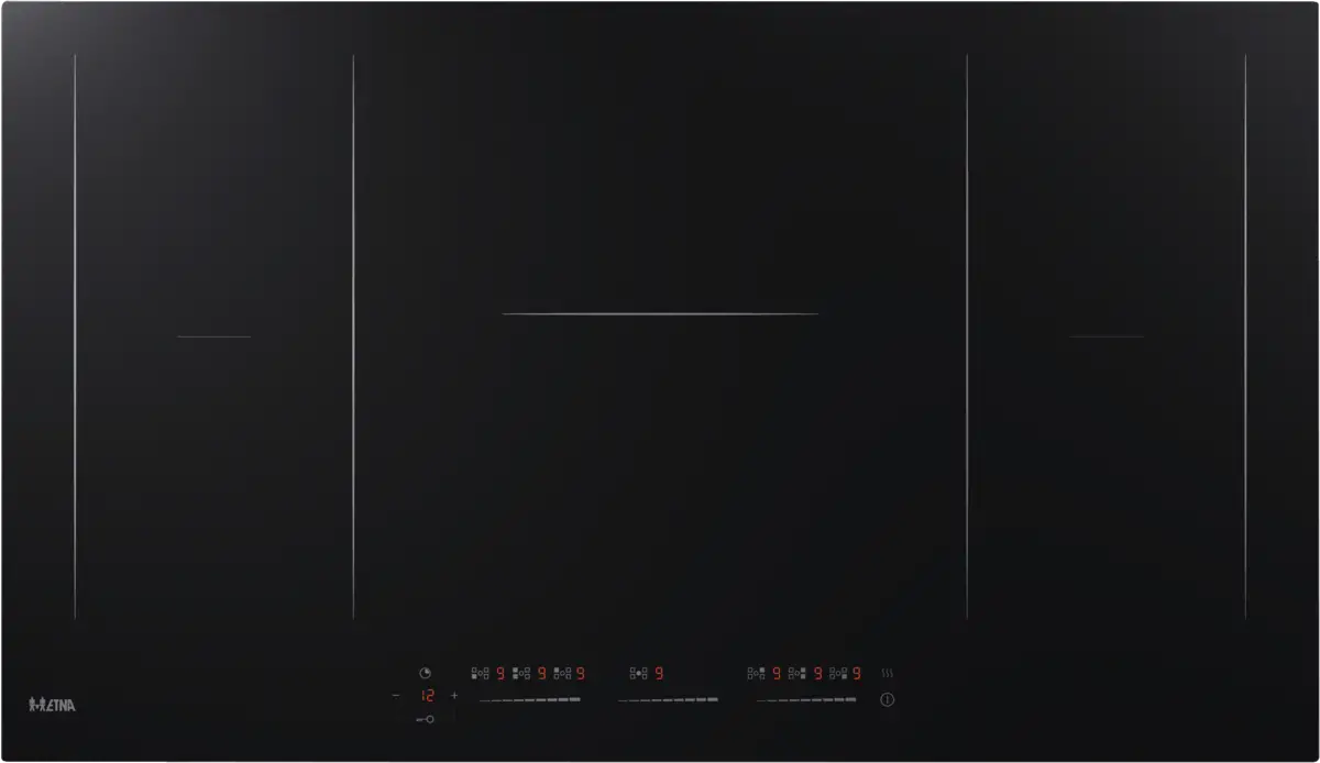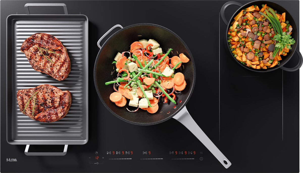 Ontdek de ETNA KIF590ZT inductiekookplaat, perfect voor ruime kookbehoeften. Met een breedte van 90 cm en 5 kookzones biedt deze kookplaat voldoende ruimte voor grote pannen. Het minimalistische design voegt een stijlvolle touch toe aan elke keuken. De krachtige middelste zone, met een diameter van 28 cm en 3000 Watt vermogen, biedt snel en efficiënt koken. De vier flexibele zones, elk met 2300 Watt vermogen, kunnen worden gekoppeld voor nog grotere kookoppervlakken. Met 10 standen en een boostfunctie op alle zones, kunt u gerechten snel verwarmen. De intuïtieve bediening met drie sliders maakt het gemakkelijk om de kookplaat aan te passen. Dankzij de warmhoudfunctie blijven gerechten op een constante temperatuur van 72°C. Ontdek de ETNA KIF590ZT voor moeiteloos koken en warmhouden van gerechten.