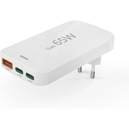 De Hama 65W snellader met inklapbare stekker bespaart ruimte in tas en stopcontact. 2× USB-C PD en 1× USB-A QC laden meerdere devices tegelijk. Ideaal voor reizen en kantoor. Hama-veiligheid voor stabiel en zorgeloos opladen.- 65W totaalvermogen