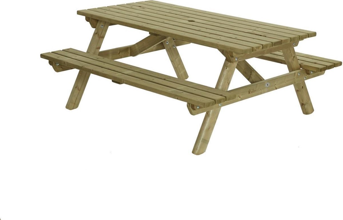 Houten picknicktafel 180x160 cmEen houten picknick tafel voor een kleine groep personen. Deze Talen picknicktafel biedt zitruimte voor ongeveer 6 volwassenen. Door de hoge kwaliteit is deze picknicktafel geschikt voor langdurig en intensief gebruik. Perfect voor in de horeca, sportclubs, recreatie, maar ook voor thuis. De picknicktafel heeft het ruime formaat van 180 bij 160 cm wordt compleet gemonteerd geleverd met parasolopening. De planken van deze tafel zijn 35 mm dik. Minder dik dan andere tafels en dat zie je terug in de aantrekkelijke prijs.Voor de productie van deze prachtige picknicktafel is gebruik gemaakt van Noord-Europees vurenhout. Dit hout is te herkennen aan het rustige nervenstructuur en kleine gezonde noesten. Het Noord-Europees vurenhout is voorzien van het FSC-keurmerk. Zo bent u verzekerd van hoog kwalitatief hout met oog voor het milieu. De picknicktafel heeft een stevige constructie, waarbij alles vanaf de onderzijde dubbel wordt geschroefd. Het hout is geschaafd en alle uiteinden zijn geschuurd, zodat u geen last krijgt van splinters. Formaat: 180x160x75 cm Bladformaat: 180×85 cm Dikte van de planken: 35 mm Geschikt voor 6 volwassenen Vurenhout met FSC-keurmerk