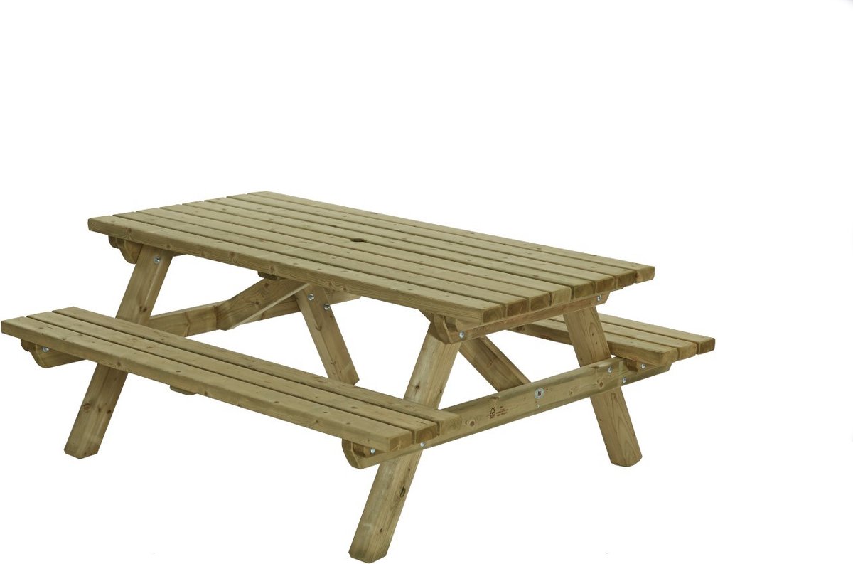 Houten picknicktafel 180x160 cmEen houten picknick tafel voor een kleine groep personen. Deze Talen picknicktafel biedt zitruimte voor ongeveer 6 volwassenen. Door de hoge kwaliteit is deze picknicktafel geschikt voor langdurig en intensief gebruik. Perfect voor in de horeca, sportclubs, recreatie, maar ook voor thuis. De picknicktafel heeft het ruime formaat van 180 bij 160 cm wordt compleet gemonteerd geleverd met parasolopening. De planken van deze tafel zijn 45 mm dik. Minder dik dan andere tafels en dat zie je terug in de aantrekkelijke prijs.Voor de productie van deze prachtige picknicktafel is gebruik gemaakt van Noord-Europees vurenhout. Dit hout is te herkennen aan het rustige nervenstructuur en kleine gezonde noesten. Het Noord-Europees vurenhout is voorzien van het FSC-keurmerk. Zo bent u verzekerd van hoog kwalitatief hout met oog voor het milieu. De picknicktafel heeft een stevige constructie, waarbij alles vanaf de onderzijde dubbel wordt geschroefd. Het hout is geschaafd en alle uiteinden zijn geschuurd, zodat u geen last krijgt van splinters. Formaat: 180x160x76 cm Bladformaat: 180×85 cm Dikte van de planken: 45 mm Geschikt voor 6 volwassenen Vurenhout met FSC-keurmerk
