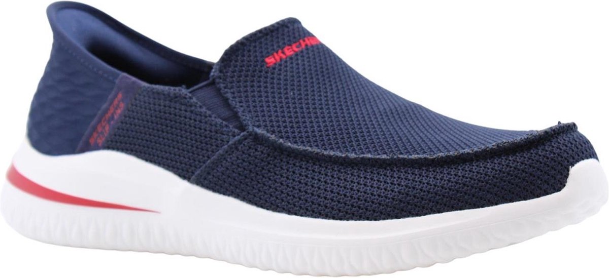 Voordelen Skechers Slip-Ins Delson 3.0 Cabrino voor herenDe blauwe heren instappers van Skechers zijn ontworpen met het oog op gemak en comfort. De Delson 3.0 Cabrino, uitgevoerd in een diepe blauwe kleur, zijn de ideale schoenen voor elke dag. Je stapt er gemakkelijk in en uit, zonder gedoe met veters, en ze voelen direct prettig aan je voeten. De zachte textiel voering en het flexibele bovenwerk zorgen voor een fijne pasvorm die zich aanpast aan de voet, wat bijdraagt aan een rustige drukverdeling tijdens het lopen en staan.