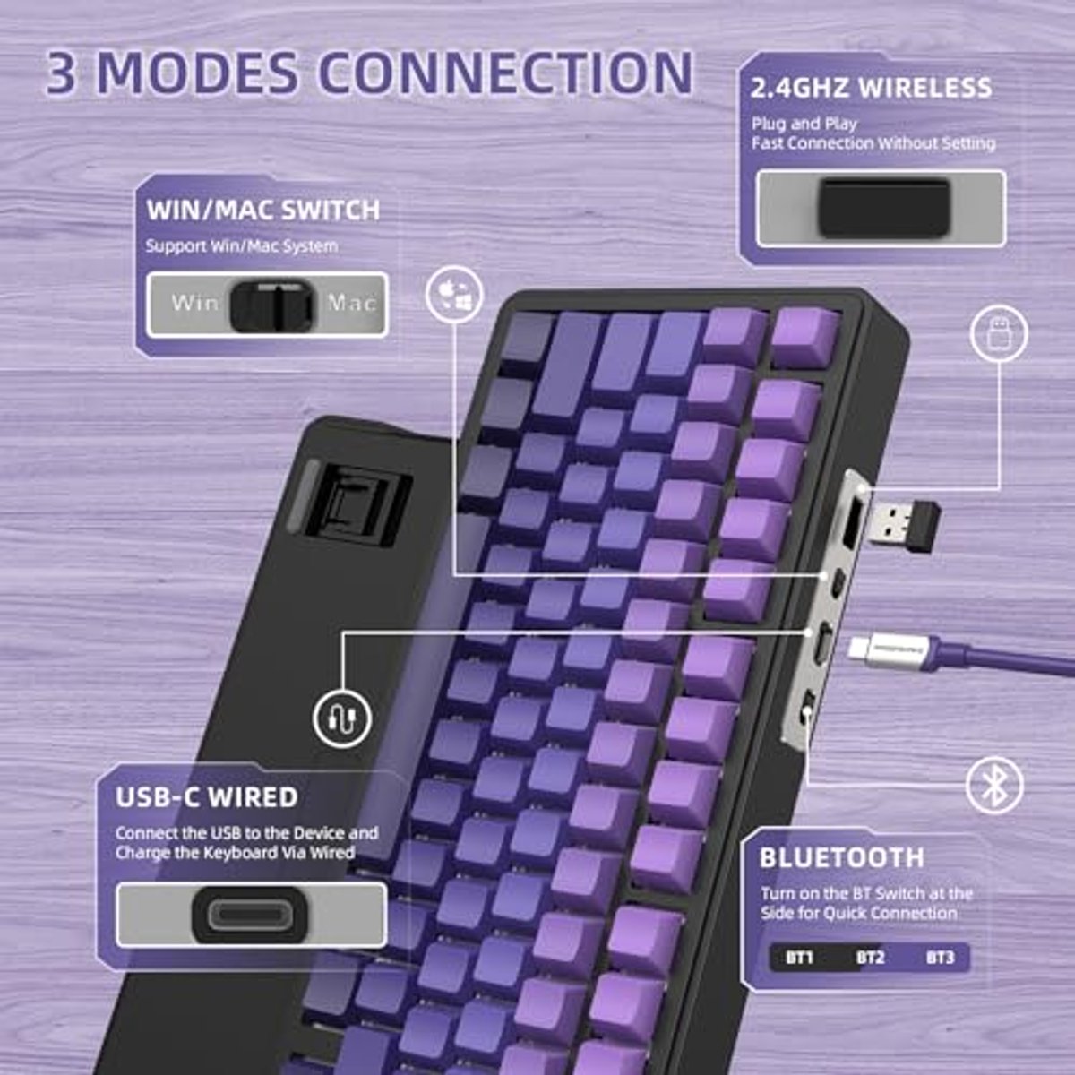 Ontdek het perfecte draadloze gaming toetsenbord met een compact 75% ontwerp. Dit mechanische toetsenbord is uitgerust met RGB-verlichting, hot-swap lineaire schakelaars en duurzame PBT keycaps. Dankzij de 5-laags vulling biedt het verhoogd comfort tijdens lange gamesessies. Geschikt voor zowel PC als MAC, met connectiviteitsopties via Bluetooth, 2.4G of USB-C.