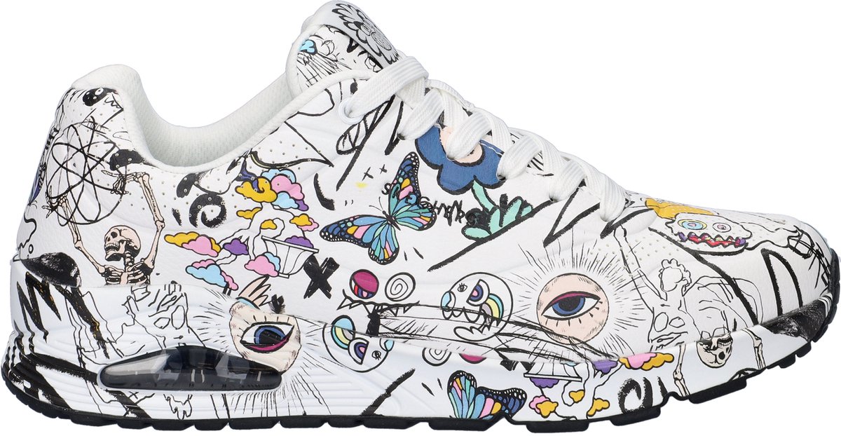 Skechers Uno Process Sketch heren sneaker. Skechers heeft inmiddels al aardig wat benoemenswaardige samenwerkingen gehad. Dit keer met kunstenaar en youtuber Vexx. Uitgevoerd in duraleer met Vexx's kenmerkende doodles. De perforatie op de neus zorgen voor een betere ventilatie. Gevoerd met mesh-textiel. Dit materiaal heeft een goed vocht- en warmte afvoerende werking en houdt de sneaker langer fris. De gewatteerde enkelkraag zorgt voor net dat beetje extra comfort. Voorzien van het Air-Cooled memoryfoam-voetbed. Deze biedt optimale demping en heeft een goede vocht- en warmteregulatie voor een beter voetklimaat. Afgewerkt met een rubberen loopzool met SkechAir-tussenzool. De luchtkamers zorgen voor een goede schokabsorptie tijdens het lopen.